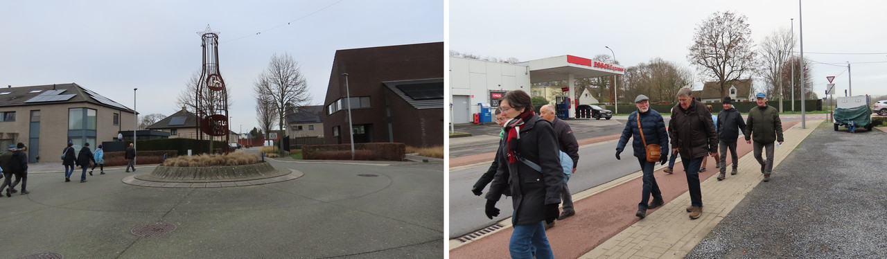 Foto's boven: de wandelaars o.l.v. Roger passeerden onder ander langs deze enorme fles die herinnert dat op diezelfde plaats ooit de Brouwerij Ango-Belge stond. (foto's Elie V.)