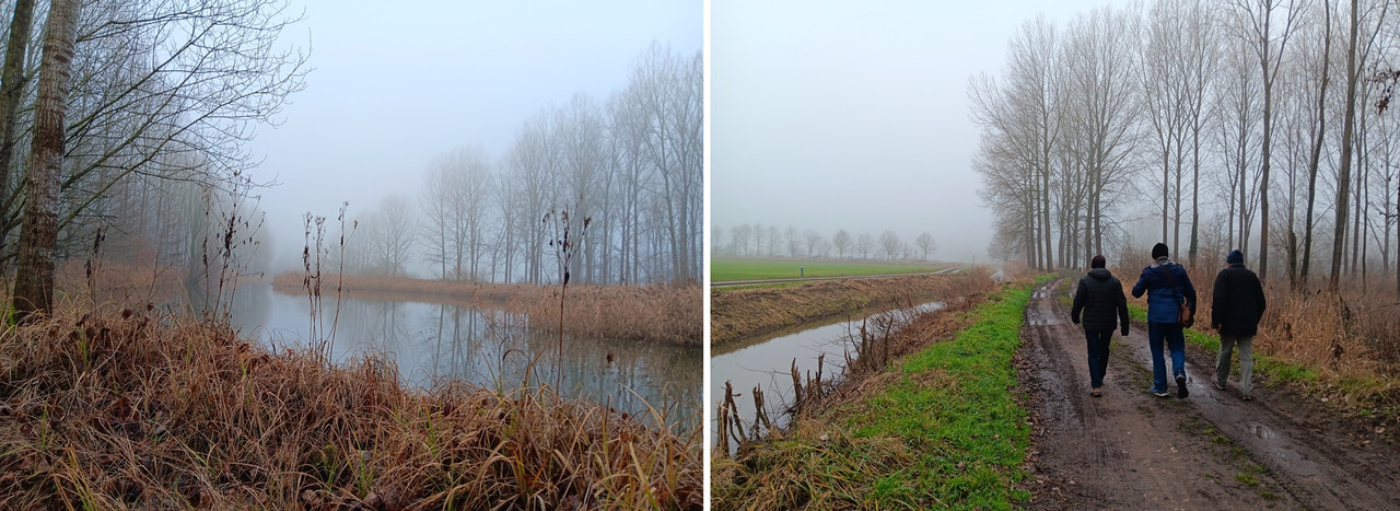 Op de foto rechts liepen we langs de Leie nabij de recent aangelegde Vlasburg die gretig wordt gebruikt door wandelaars en fietsers al dan niet met een recreatieve bedoeling. Links de oude Leie met een voormalige ast, als stille getuige van de tijd dat toen het vlas werd geroot en nadien gedroogd in de ast. Sommigen staan er nog wezenloos bij, anderen werden omgevormd tot woningen.