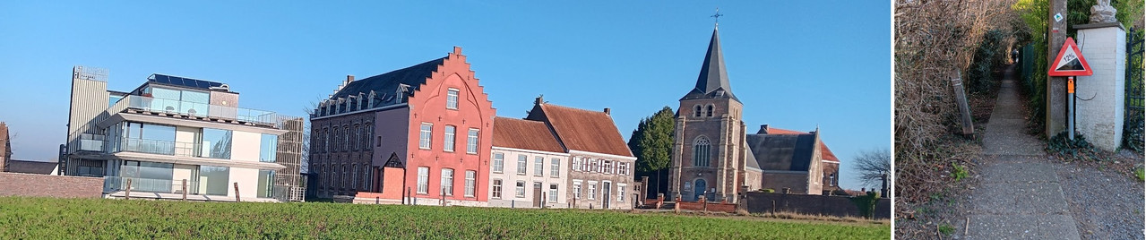 Onder Edelare met de Sint-Martinuskerk. Sinds 2025 aan de eredienst onttrokken. Links het steile baantje ergens tussen Leupegem en Edelare.