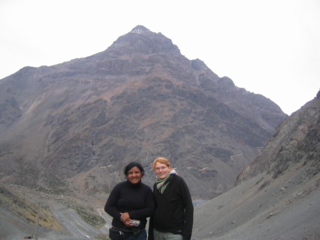 carolina en ik op de heenrit in het chileense andesgebergte, toen lag er nog geen sneeuw.