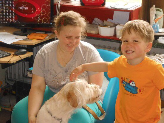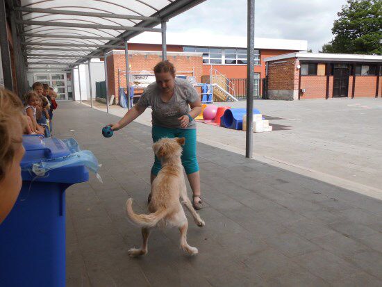 U hebt het misschien al van uw kinderen vernomen : elke dinsdag komt juf. Kiana stage doen in onze klas. Ze is slechtziend en volgt een opleiding tot hulp in de kleuterklas. Deze week bracht ze haar blinde-geleidehond 'Lady' mee. Ze leerde ons dat Lady een gewone hond is als hij een gewone leiband aanheeft. Dan mogen we hem strelen en ermee spelen. Als hij echter zijn harnas aanheeft, moet hij werken. Dan mogen wij hem niet roepen of strelen. Juf. Kiana toonde ons hoe hij haar over en rond opstakels heen helpt en hoe hij haar helpt om de straat over te steken. Het was niet alleen leuk maar ook leerrijk. Dank u wel, juf. Kiana.