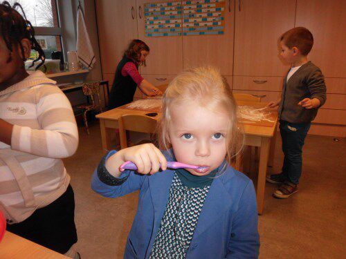 Op vrijdag poetsten we onze tandjes in de klas. Oh, wat was dat een belevenis.