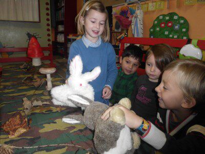 Vandaag kregen de kleuters een tafelpoppenspel te zien over een konijntje, Bubbel, dat heel lange oren had... Wie zou nog kunnen navertellen wat er met Bubbel gebeurd is? Misschien helpen deze foto's, want wie wou, kon het verhaal zelf naspelen!