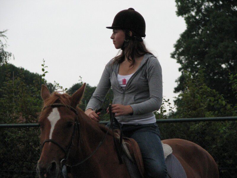 Vandaag even bijkomen van al de achtbanen. Ben nog steeds een beetje misselijk. Vanmiddag zijn we weer bij zo'n gratis speeltuin geweest waar ze hier in België patent op hebben. Het Fonteintje. Er was ook een hele hoge uitkijktoren die we uiteraard hebben beklommen. Was erg goed voor de misselijkheid. (Weer eens) patat gegeten en daarna door naar de manege. Zo ongeveer elke vakantie wil/moet/gaat Hannah paardrijden. Eigenlijk wilde ze naar een Nederlandse manege want een paar jaar terug ging ze ook rijden in een Belgische en toen riep die man haar allemaal onverstaanbare aanwijzingen toe. Het is nu toch een Belgische geworden. Gewoon mee in de gevorderden les. De man was deze keer goed te verstaan en gelukkig kon ze het nog. (Al vond ze zelf dat haar houding vreselijk fout was toen ze de foto's zag.) Draven, stappen, rondjes, figuren, het was weer helemaal geweldig. Alleen had ze geen handschoenen aan dus twee grote blaren.