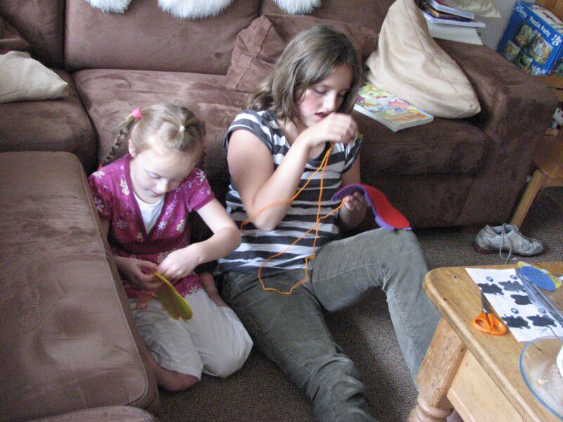 Mirthe en Jasmijne aan het handwerken. Zo waren Else en ik vroeger altijd bezig. De knuffels zijn inmiddels genaaid en Mirthe wil ook wel zo'n pakket voor haar verjaardag. (hint hint Else)