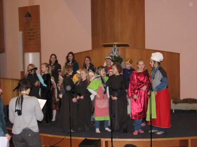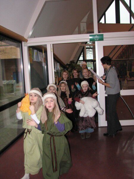Vanmorgen voor de laatste keer geoefend voor de kerstmusical Morgenmiddag om 2 uur gaat het gebeuren. Gelukkig was Hilde met haar hand in het verband weer in staat om te dirigeren en de band in goede banen te leiden. De herders (allen vrouwelijk met een gemiddelde leeftijd van 6 lentes) waren zeer overtuigend met z'n achten. Zelfs zonder microfoons zouden ze iedereen op het kerkplein nog wel bereiken dus mét was het .....nou ja,..... prachtig ! Mirthe als waard van de herberg zong ook zeer verstaanbaar en Leendert gaat achter het beam-machien. Gezellige familie bijeenkomst. O ja, vergeet ik Hannah nog. Die is gecharterd als achtergrondzangeres. Nog één nachtje slapen. Dan gaan we los.