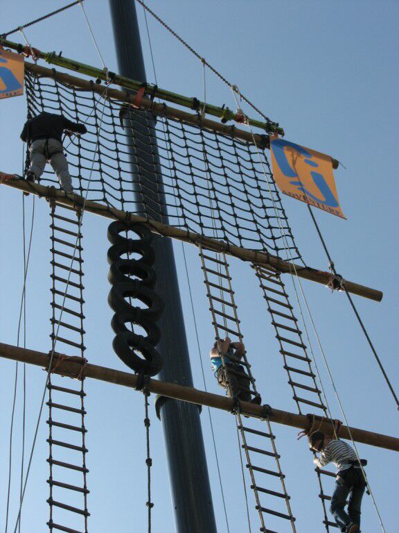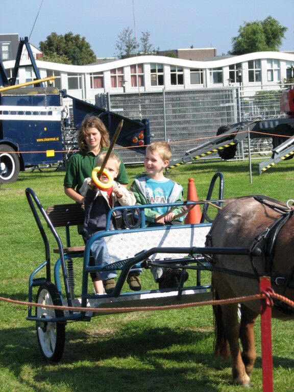 Je bent Hooglander of niet hè, dus zijn we weer naar het dorpsfeest geweest. Geen klimwand deze keer maar een hijskraan met een heel hoog net eraan waar je, gezekerd en wel, in moest klimmen. Mirthe is de uitdaging aangegaan. (Zowel Hannah als Dick waren net ziek geweest en voelden zich nog niet in staat tot grootse prestaties.) Ze is boven gekomen. Ruim 25 meter de lucht in en dan werd je weer naar beneden getakeld. (Zeg maar 8 etages omhoog via een touwnet.) Ze was geheel uitgeput toen ze weer met twee benen op de grond stond. Jasmijne ging iets minder vermoeiend in de autootjes en na een portie poffertjes hadden we het dorpsfeestgevoel helemaal te pakken. En toen zagen we ook nog Axel en Ivar die aan het ringsteken waren. Helaas kregen de paardjes precies na hun beurt een half uur pauze dus Jasmijne heeft het niet kunnen doen.