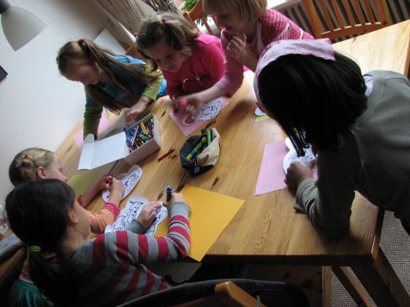 plek. Geen geruzie wie waar zit of waar je juist niet wil zitten. En voor elk onderdeel/spelletje pak ik de vissen er weer bij. Na de poffertjes de kadootjes (Jasmijne is weer helemaal gelukkig met alles) en toen zijn we placemats gaan maken. Ik had een paar kleurplaten geprint die ze gekleurd hebben. Die hebben we op gekleurd papier geplakt en versierd met stickertjes en toen alles door het lamineerapparaat. Daarna de kringspelletjes die volgens Jasmijne bij een echt feestje horen : zakdoekje leggen en "de reis". Ook al jaren een hit op alle feestjes bij ons. In