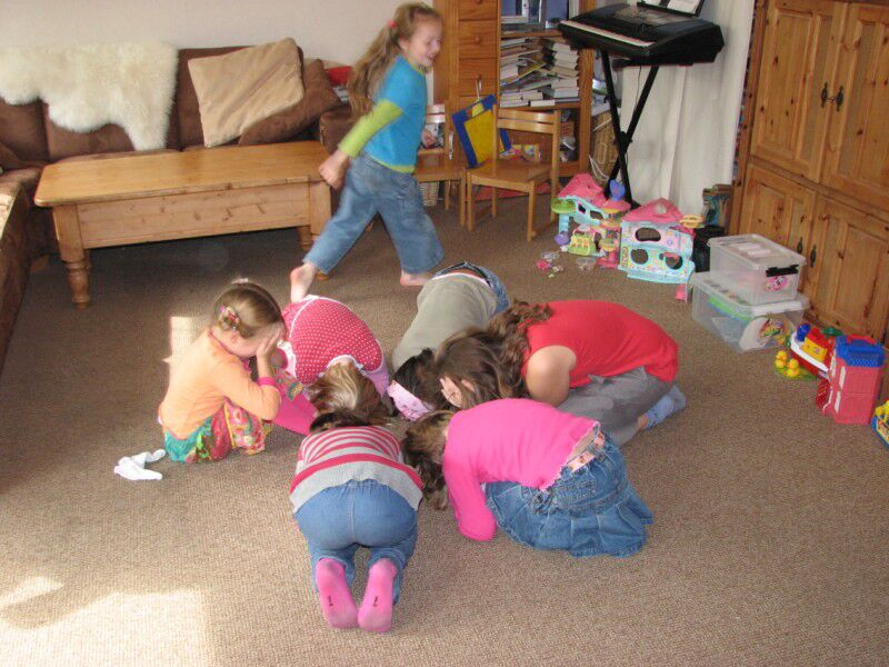 via een stoeltje de salontafel over (een boomstam over de rivier) en dan via een stapel kussens (de duinen) naar de zee (een teiltje warm water). Maar we beginnen geblinddoekt boven aan de trap (één voor één, de anderen spelen ondertussen boven). En dan vertellen we dat we boven op een berg staan en op reis gaan. Eénmaal beneden zien we een moeras. Daar moeten eerst de sokken voor uit en dan dus verder tot de zee. Het mooiste was nog dat zodra een kind de blinddoek afdeed de rest uitgebreid ging vertellen dat er geen echt moeras was en dat de boomstam over de rivier de tafel was. Jasmijne