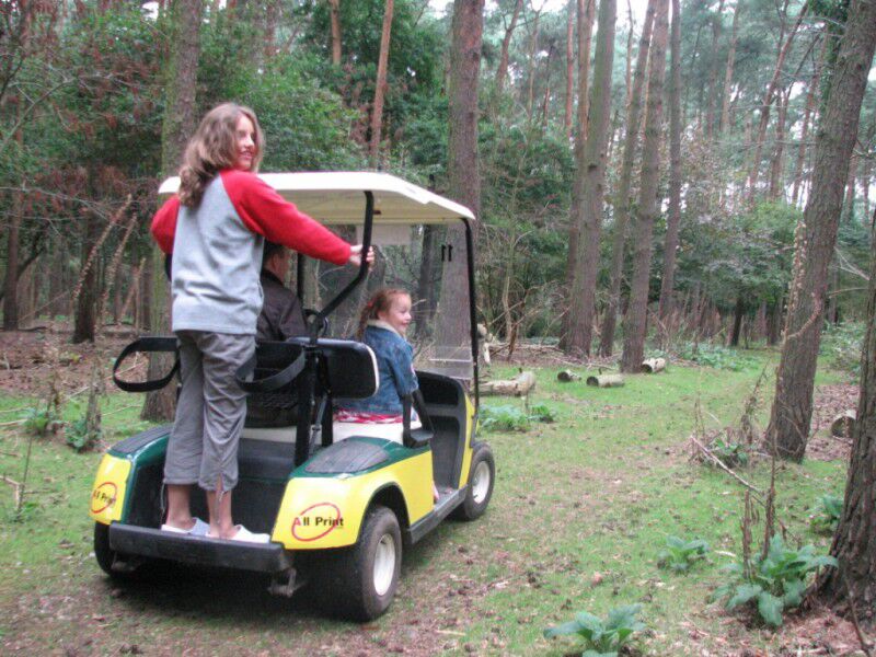 Vandaag naar een soort van tuincentrum geweest waarbij ze een heel stuk bos hadden met allerlei dieren en waar je met een golfkarretje doorheen mocht rijden. Ollevier en co heette het. Vlakbij Ham waar we de vorige keer op vakantie waren (...... over tenten springen is elastisch.... mama mia....) Op de site stond dat ze 5 persoons karretjes hadden maar get bleken 2 a 3 personen in te kunnen. Leendert ging met Hannah en ik met de rest. Al voor ik Jasmijne had vastgesnoerd trapte Mirthe op het gas dus dat begon leuk.