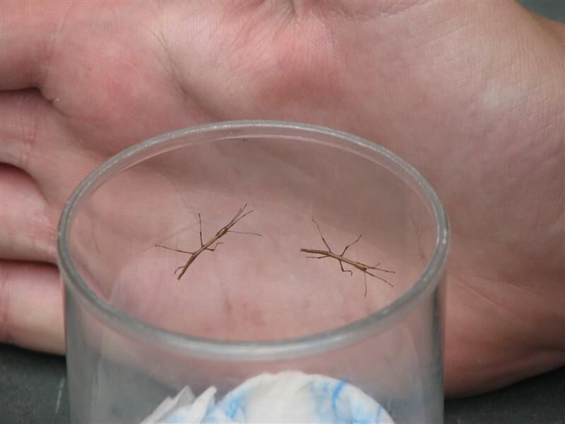 Heugelijk nieuws. Twee van de negen eieren van de wandelende tak zijn uitgekomen. Zondag hadden we het nog over ze en hebben we uitgebreid naar de eitjes staan kijken en kwamen we tot de conclusie dat deze leg waarschijnlijk niet zou uitkomen. Maar gister middag komt Mirthe ineens aanrennen met het potje in haar handen en ja hoor. Twee beestjes. De één heeft een krulstaart en kan heel hard lopen en de ander zit het liefst tussen twee blaadjes. Krullie heet Tak en de ander Tic. Er komen er nog 7 (als het goed is) en die namen kunnen we uitkiezen uit : take, (of teek), tuc, toek, tec (of op z'n engels : tag), tijk, taak, tok(tok) en ga zo maar door. We hebben gelijk het aquarium omgedoopt tot een herbarium en daar zitten ze nu in (denk ik want alleen Tak laat zich zien.) Maar Tak heeft een tic. Die strekt zich telkens heel hoog op z'n pootjes uit en dan wiegt hij van links naar rechts. Misschien moeten we zorg voor hem inkopen.