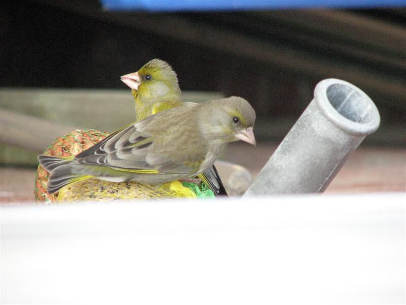 We hebben hele mooie vogeltjes in de tuin. Volgens het boekje sijsjes. Vanuit het bovenraam hangend kan je prachtige foto's maken want ze komen allemaal af op de vetbollen die aan de vlaggenstokhouder hangen. En dat er dan een meter boven hun kopje iemand met een fototoestel uit het raam hangt hebben ze dan niet zo door.