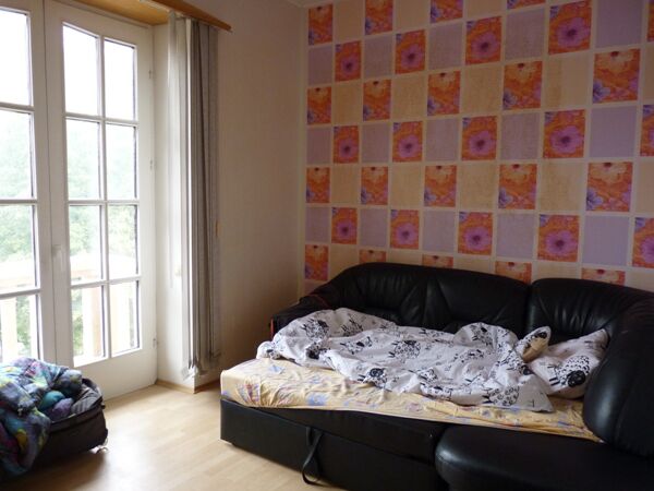 Mijn kamertje Ik heb zelf gekozen voor het kleinste kamertje met zetelbed (ipv gwn bed) omdat ik dit het gezelligste vond.. Het heeft ook al een bureau, leuke bloemetjes op de muur, en een groot raam dat naar m'n eigen persoonlijke balkonnetje leidt