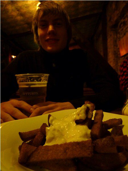 Andrea en Elisabeth die een week eerder in Vilnius geweest waren, hadden ons gezegd dat het zeker de moeite was om naar een balletvoorstelling te gaan kijken in de mooie theaterzaal.. Dat zagen wij ook wel zitten, er was echter een klein probleempje.. Er stonden geen balletvoorstellingen op het programma op de dagen waarop wij in Vilnius waren.. Wat er wel op stond was "Frankensteinas", een opera.. Aangezien het ons maar 9 euro zou kosten, dachten we: "waarom niet?" .. Na het eerste deel dachten we echter: "Waarom hebben we dit gedaan? .. Het eerste deel was eerder theater ipv opera en omdat ons litouws toch nog niet helemaal perfect is, verstonden we daar natuurlijk geen woord van (met uitzondering van af en toe eens een "hallo" of een "danku") .. Het 2e en 3e deel waren veel beter, hoewel sommige liedjes toch écht wel lang duurden.. Op onze terugweg naar de jeugdherberg kwamen we dan een leuk cafeetje tegen waar enkele lokale biertjes en snacks geproefd hebben.. De foto toont gefrituurd brood met een looksaus.. Ondanks het feit dat we die avond ongeveer 10 minuten onze tanden hebben staan poetsen, proefden we de look nog toen we de dag nadien opstonden..