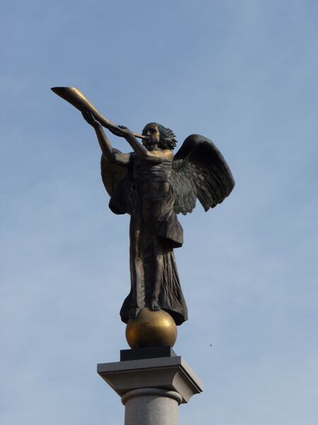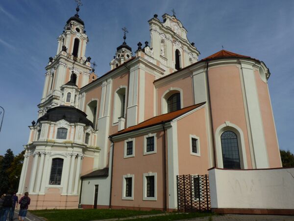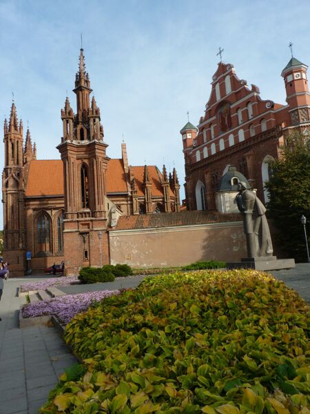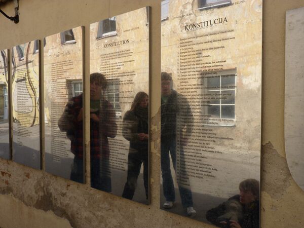 Op zondag wilden we Trakai bezoeken, een mooi natuurgebied met een groot meer, waarin zich een kasteel bevindt.. Op een eiland weliswaar.. Niet in het meer.. Maar de trein vertrok pas 's middags, dus hebben we in de voormiddag nog een beetje rondgeslenterd in Vilnius zelf.. Er zijn in totaal zo'n 22 kerken denk ik.. We hebben er véél van gezien.. Mijn excuses, maar ik weet echt alle namen niet meer.. De 2e foto is St.Anna's Church en dat is alles dat ik nog weet.. Tijdens onze wandeling kwamen we plots een brug tegen met daarbij een bord dat het begin van de staat "Uzupis" aankondigde.. Dit is blijkbaar een onafhankelijke mini staat binnenin Vilnius.. Het heeft z'n eigen grondwet en alles erop en eraan.. De engel van Uzupis is het nationale symbool.. De grondwet geeft iedereen het recht op warm water, verwarming, een dak boven z'n hoofd; maar ook het recht om gelukkig te zijn, geliefd te zijn, bang of verdrietig te zijn, enz.. Ook voor honden is dit the place to be want zij hebben hier zowaar het recht om een hond te zijn..