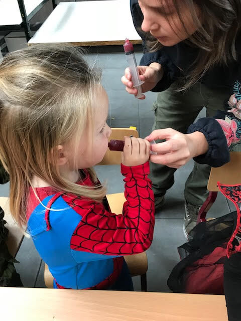 Halloween was ook heel leuk! Vooral de afsluiter toen we verkleed naar school mochten komen en er een heus halloweenfeest was. 's Middags was er een modeshow en mochten we smullen van al het lekkers dat er in de voormiddag door alle kinderen gemaakt was. We proefden zelfs van de "bloedspuitjes" (mix van rood fruit in de blender met appelsap)! Voor sommigen een grote overwinning!