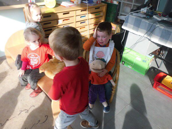 Tuur onze echte dierenvriend heeft een kip opgenomen om eens de vriendjes van dichtbij te laten kijken en sommigen durfden zelfs al eens te strelen.