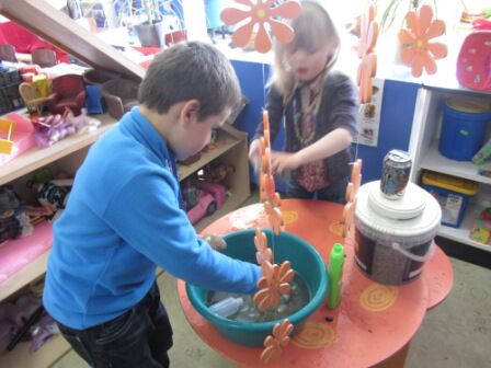 met sponzen, vissen zoeken volgens kleur, spulletjes zoeken en uit het water